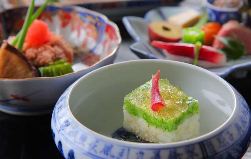 大分のブランド魚「関あじ」を姿造りにてご堪能いただけます。全く臭みがなく、口にいれると旨みが広がります。大分のブランド牛「おおいた和牛」の茶しゃぶは、玄米茶を使用。ほのかに香る香ばしい玄米茶と抹茶の香りと共にお楽しみください。
